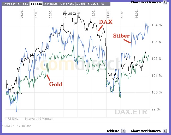 Habe zur Illustration mal den Gold- & Silberspotpreis mit dem DAX im 10.Tages-Chart geplottet.