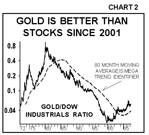 Note that the mega trend changed in 2002 when the ratio between gold and the Dow Industrials changed to favor gold (see Chart 2). These changes do not happen often but when they do, then the pendulum has swung and it still has a long way to go. This means that gold will continue to outperform stocks for years to come, like it's done in recent years. So this is another key mega chart to keep in mind when investing.....