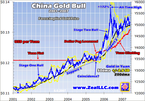 Now you sharp-eyed students of the markets have no-doubt noted that the China gold bull looks an awful lot like the US gold bull. Indeed. This is largely due to the yuan currency peg which existed for the decade ending July 2005. As you can see above reflected in the red yuan price, the Chinese currency was dead flat for the first four years of this gold bull. It was hard-pegged at 8.28 yuan to one US dollar, or a little over $0.12.