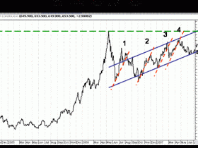 In figure 1 we can see that the consolidation has been fairly well contained between the blue support and resistance lines. We can also see that the uplegs have had a very consistent slope taking about two months to rise from the bottom support line to the upper resistance, and this is depicted by the parallel red dotted lines. Despite optimism rising during each of the uplegs it was clear that the ONLY way that gold could hope to make a new high would be for it to blast through the top of this trend channel. This only transpired on the very first rally marked “1” on the chart. When the top resistance line was encountered which was far below the 25 year high of $720 what was the inducement for investors to rush in? The answer is “none”! And they didn’t! They just yawned.