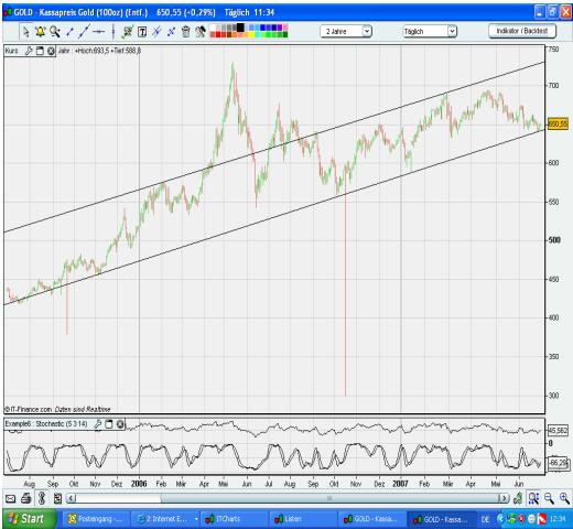 Ich kann mir eher vorstellen, daß Gold bis 658 läuft und dort wieder abprallt - schaut euch den Chart an - da bildet sich ein kleiner Abwärtstrend (658 ist die obere Begrenzung des Kanals). Nix mit 650 bzw. 651 wie ich seit Tagen lese ![]()