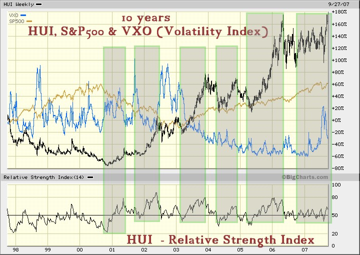 Es ist ein Vergleich von HUI, S&P500 Index und VXO Volatility Index bei dem mir etwas Interessantes aufgefallen ist, bezüglich des Stellenwertes der Edelmetallminenaktien gegenüber dem üblichen Aktienmarkt.