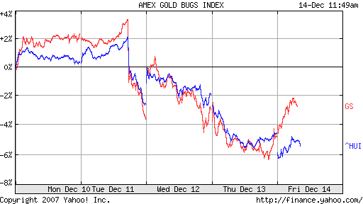 Solange der HUI (blau) unter GS (rot) ist hat das PPT die Kontrolle ueber den Goldmarkt.