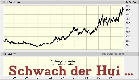 Du solltest Dein Investitionszeitfenster, welches stark mit Deinen Gefühlen korreliert, eventuell auf Sekundenbasis umstellen. Dann wären wir dieses unsinnige tägliche Betrachten des HUI inkl. Gejammer oder totaler Euphorie (je nach Situation), endlich los!