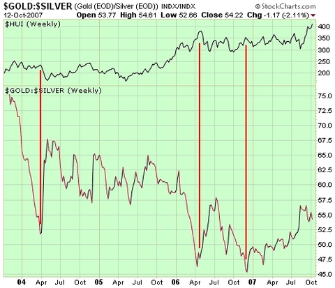 Betrachtet man den linken Chart, sieht man daß scharfen Abwärtsbewegungen beim Gold/Silber-Ratio Hochpunkte bei den Minen und beim Gold-/Silberpreis folgen. Eine solche Abwärtsbewegung haben wir jetzt wieder (rechter Chart), aber etwas Luft nach unten ist schon noch. Sogar sehr viel, wenn man das Ratio der letzten Hausse 1980 (bis zu 17 : 1) bedenkt. Ich denke mal, daß das Gold/Silber-Ratio sich in den nächsten Jahren wieder mindestens bis zu diesem Wert hin bewegt, wenn auch unter großen Schwankungen. Silber kaufen und nach Hause schleppen lohnt sich!