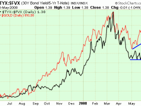 Die einem Artikel von Boris Sobolov entnommene Korrelation von Gold versus die Korrelation von 5- und 30jährigen Bonds ist schon mit freiem Auge so überzeugend, dass es mich wundert, dass sie eigentlich nicht mehr Verwendung findet. Die Parallelität ist stupend.