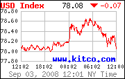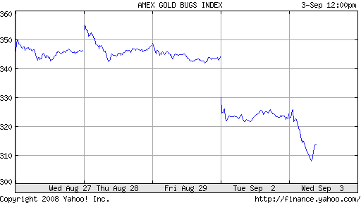 respectively of the entire Comex short positions in these two metals. Will Tuesday's numbers be in this week's COT? Even though yesterday was the cutoff for Friday's report, I'm not holding my breath.In other news, I see that Australian gold output was down 13% in the Q2/08. Harmony Gold had to close a couple of mine shafts after 3 miners died on the weekend. British Chancellor of the Exchequer, Alistair Darling, said in a story out of The Guardian that Britain is facing "arguably the worst economic downturn in 60 years" which will be "more profound and long-lasting than people had expected." Of course it's that bad, or worse, in the USA, but they're just better at cooking their books than the Brits...and they’re far