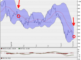 die verengten bollinger bänder kündigen eine starke Veränderung an (Pfeile)