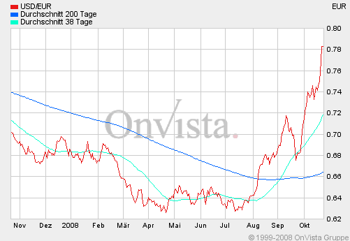 Für die Amis herrscht momentan einfach eine komplette Deflation, einschließlich ausländischer Assets, die sie schnellstens loswerden wollen/müssen. Das drückt sich natürlich für uns in einen steigenden Dollar aus. Ein nicht unerheblicher Teil der deutschen Aktienhausse war z.B. auch von Amerikanern, die nicht mehr wussten wohin mit dem billigen Geld, aufgebaut. Wenn die nun ihre Aktien hier wieder verkaufen, was machen sie? Genau, Dollar kaufen und nach Hause tragen. Selbst Dollar-Konten im Ausland lösen die Amis sicherheitshalber auf und nehmen die Dollars wieder nach Hause. Was muss die ausländische Bank dabei machen? Richtig, Dollar kaufen