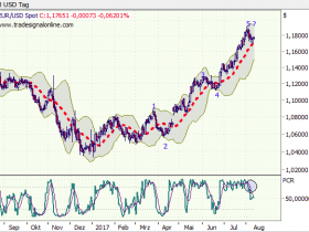 1,1785 $ entspricht exakt a=c in den Unterwellen. Es könnte jedoch noch etwas weiter steigen bis in den Bereich 1,1799 $ - 1,1826 $. Je weiter sich der EUR den 1,1826 $ annähert, desto wahrscheinlicher wird es, dass es sich bereits um Welle b (orange) handelt.