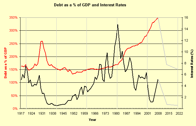 After the roaring Twenties took debt to 270% of GDP in an unsustainable way, the collapse of this debt led to the great Depression, WWII, and a distinct distrust of paper assets and debt. Debt levels then returned to a more manageable 150% of GDP before rising again, mostly from the growth of mortgages as the real estate and commodities bubble took hold in the late 1970's. When these real asset bubbles collapsed, much of the funds moved to the Nikkei forming another bubble and pushing the Yen sharply higher in the late 1980's. Once the Japanese bubble collapsed, funds flowed back to US and European markets fueling their rise in the late 1990's, and confirmed by the rising US Dollar. The ensuing US market collapse of 2000 sent the funds back into real assets like Commodities and Real Estate, but this time embracing even more debt and leverage to 350% of GDP. We have phenomenal growth of credit in absolute terms too, with US Treasuries and total credit both expanded 9-10 times since the first bubble formed 27 years ago. Since we are already seeing the first flight away from risky paper, history is likely to repeat itself, and 60% of this debt will be eventually wiped out mostly worthless in the next 5 to 15 years
