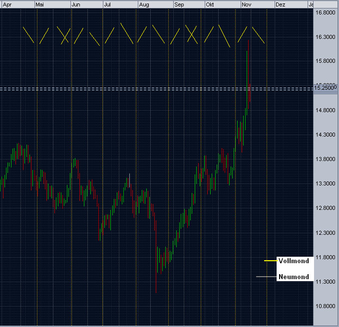 Ging ja dieses Jahr auch wieder sehr gut, leider bin ich jetzt erst darauf gestoßen! Im Sept. gings einmal voll daneben... Aber da war auch am 11.09.07 als Neumond war eine Sonnenfinsternis. Sonnenfinsternis bringt immer etwas durcheinander... Obwohl Silber bis 14.09. etwas verlor... ![]()