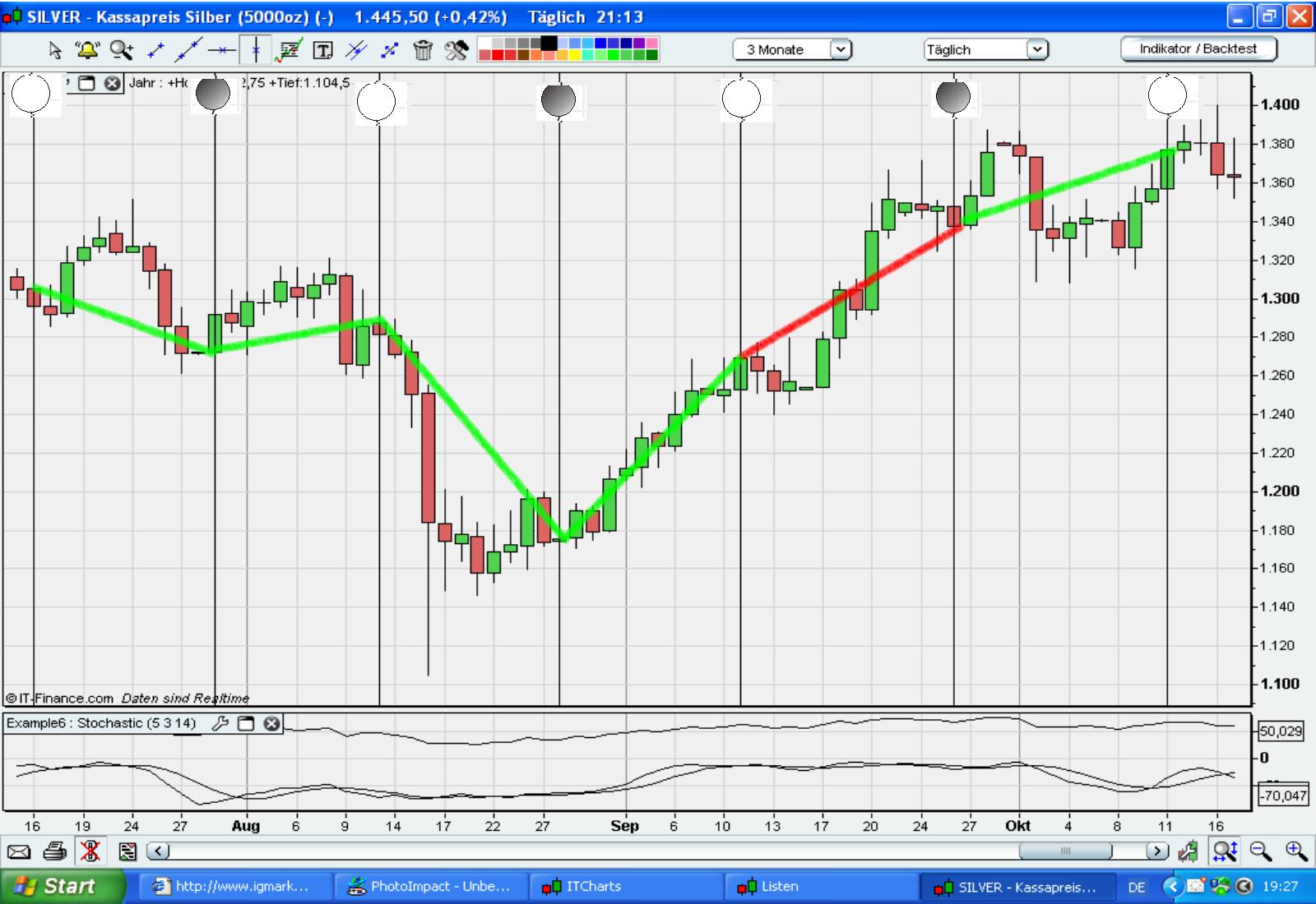weiterhin habe ich in größerer Darstellung (ca 4 Monate) die Charts entsprechend gekennzeichnet - grüne Linie = stimmige Vorhersage, rote Linie = unstimmige Vorhersage