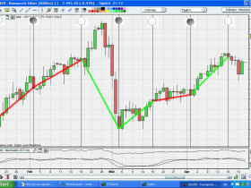 weiterhin habe ich in größerer Darstellung (ca 4 Monate) die Charts entsprechend gekennzeichnet - grüne Linie = stimmige Vorhersage, rote Linie = unstimmige Vorhersage