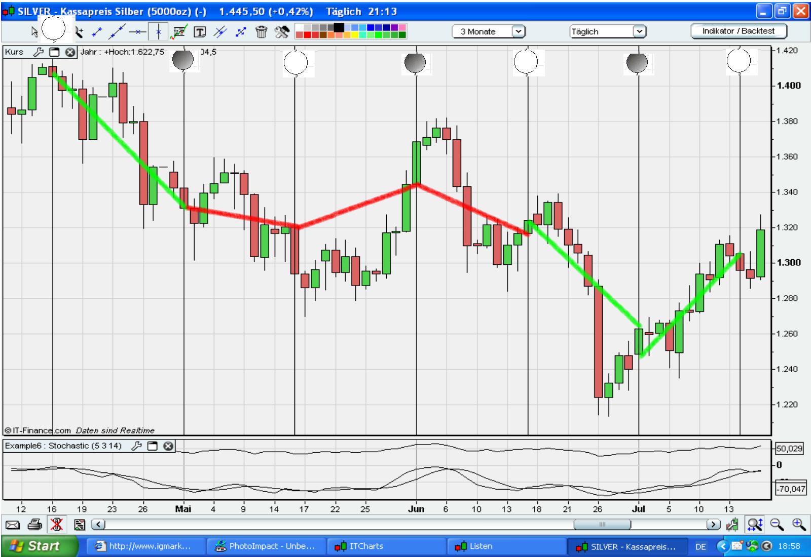 weiterhin habe ich in größerer Darstellung (ca 4 Monate) die Charts entsprechend gekennzeichnet - grüne Linie = stimmige Vorhersage, rote Linie = unstimmige Vorhersage