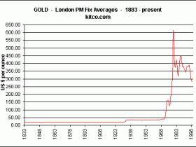 Wichtig ist, daß damals der Preis ganz anders gemeint war. $162 heißt nicht $162/oz sondern $162/$100 Gold. D.h. $20/oz war schon gültig. $100 entsprachen somit 5 ozs. $162 Goldpreis heißt nichts anderes als daß $100 = 5 ozs das offizielle Umtauschverhältnis war, am Markt aber $162 für 5 ozs bezahlt werden mußten. Somit entsprechen $162 in Wirklichkeit $32.50. Geht man von Inflationsbereinigt $520 2006 = $20 1930 und davor aus, entspräche das einem heutigen Goldpreis von $850.