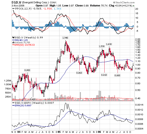 The first is Energold Drilling - EGD.V. Energold has a history of 20% annual growth of new drills in the field and the company is now ramping up growth even more rapidly. Meters drilled in Q2 2006 are up 39% over the comparable quarter in 2005. Energold is experiencing its 4th consecutive year of profitability and looks to offer a nice surprise this year with both the increase in the number of drills in the field as well as number of meters drilled.