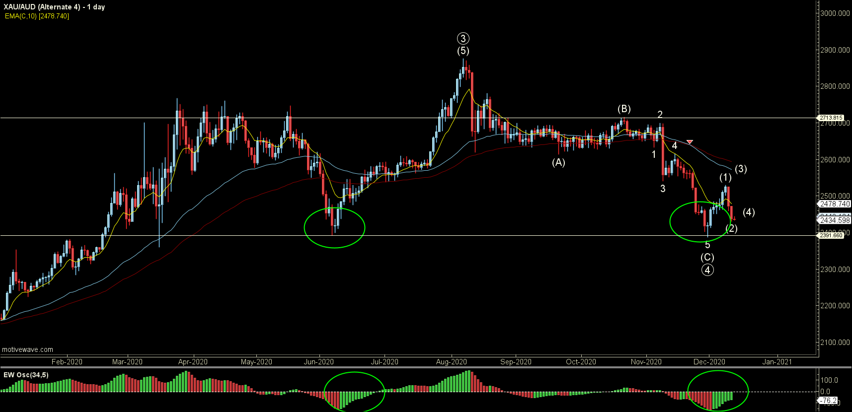 Bis 0,42 A$ wäre noch aus charttechnischen Gründen möglich. Jedoch ist das schwer vorstellbar angesichts des Chartbildes beim Goldpreis.