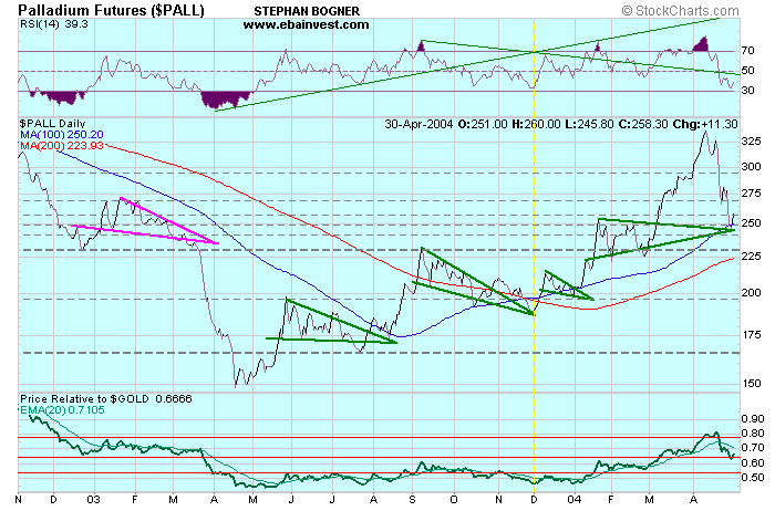 Im April 2003 fand Palladium nach einem 2 jährigen Abwärtstrend einen Boden bei $150 je Feinunze. Im August des gleichen Jahres überquerte der Palladiumpreis erfolgreich die 100-Tages-Durchschnittskurve (Moving Average) mit Hilfe einer Dreiecksformation. Im Dezember konnte die 200-Tages-MA ebenfalls mit einer Dreieckskonsolidierungsformation nachhaltig überschritten werden. Gleichzeitig kreuzten sich diese beiden Durchschnittspreiskurven; die 100-MA-Kurve notierte fortan über der 200-MA-Kurve, welch Ereignis ein charttechnisches Signal a la Hausse gab. Von Januar bis März 2004 konsolidierte der Palladiumpreis erneut mit lehrbuchmässigen 4 Wellen innerhalb eines Dreiecks. Der Breakout glückte bei $250 und stieg bis $330 Anfang April. Danach folgte ein schneller und heftiger Pullback zurück zur Dreiecksspitze bei $250. Nachdem der Preis in der Folge von der Spitze wieder nach oben tendiert, spekulieren wir seitdem auf einen bald erneut stark steigenden Palladiumpreis, da wir die aktuelle Konsolidierung als beendet betrachten. Eine Impulsbewegung aus der vorherigen Preisformation dürfte unmittelbar bevorstehen ("Thrust"). Wir haben uns für ein Zertifikat auf den Spot-Palladiumpreis entschieden.