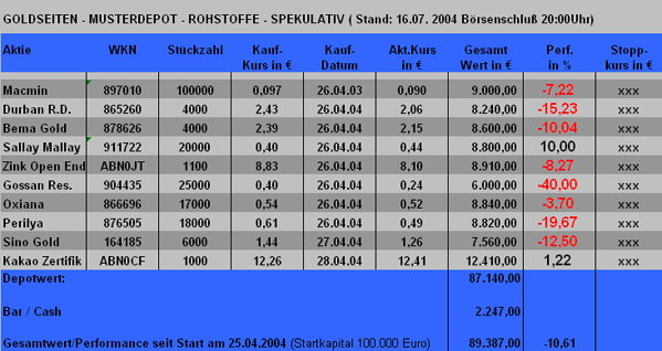 Die Werte des spekulativen Musterdepots haben während dem Abverkauf vom April/Mai sehr starke Kursverluste teilweise gar Kurshalbierungen hinnehmen müssen. Nun in der Erholungsphase ist dafür das Erholungspotential entsprechend grösser. Ich denke, dass wir bei einigen dieser Werte in den nächsten Wochen sehr starke Kurssteigerungen erleben werden, z.B. bei Werten wie Perilya oder Sally Malay, welche nach wie vor als sehr günstig erscheinen.