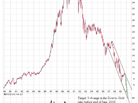 So so, die langfristigen Dow/Gold-Ratios waren alle nur schwachsinnige Einbildung ? Der Dow wird wieder fuer ein bis zwei Unzen Gold (momentan ueber 9) zu haben sein, manche sagen sogar fuer eine Viertel-Unze.