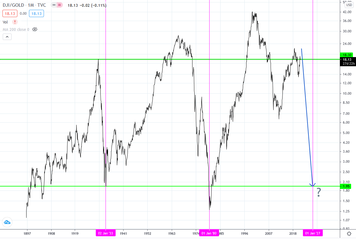 Der ansteigende Trendkanal der DOW/Gold-Rate zeigt zunächst mal, dass Gold gegenüber Aktien innerhalb von 200 Jahren an Bedeutung verloren hat und dies weiterhin tut.