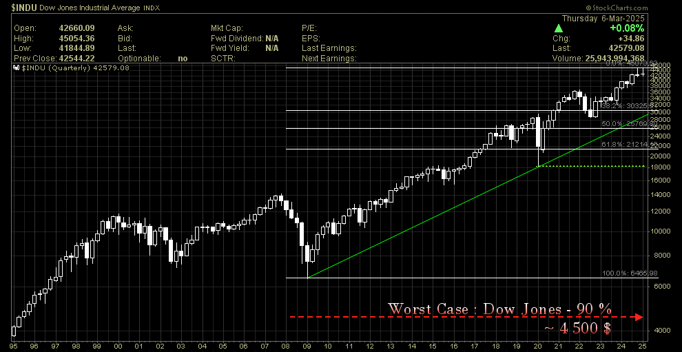Den höchsten Verlust ausgehend vom Top markioerte der Dow in Folge der Weltwirtschaftskrise 1929 folgend mit ca. 90 % ! Damit wurde mehr als 100 % der vorangegangen Rallye ausgelöscht. Ausgehend von aktuell ~ 44 000 $ würde uns ein 90 % Absturz des Dow tatsächlich auf etwa 5 000 führen.