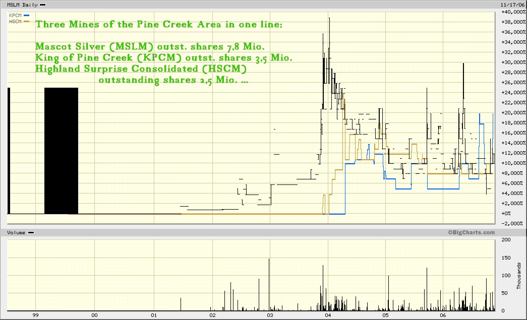 Die Marktkapitalisierung der Minen dort im Pine Creek Areal ist gering, im Falle von HSCM liegt sie bei bei 2,5 Mio Shares outstanding, sowie 5 Mio Shares authorized.
