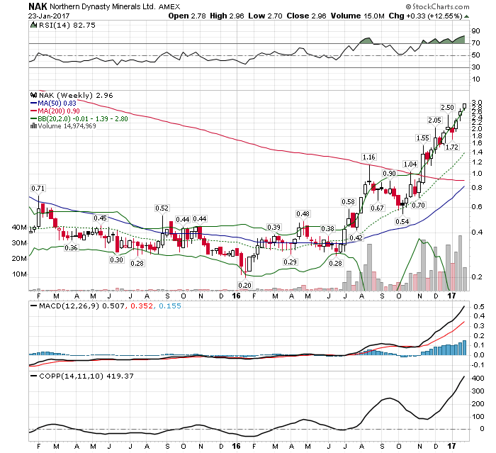 Beim Pebble-Projekt geht es um Metalle im Wert von aktuell ca. 380 Milliarden USD, i.w. Kupfer und Gold. Die Marktkapitalisierung von Northern Dynasty liegt noch bei unter einer Milliarde USD. Ich lasse mich mal überraschen, wie hoch der Kurs noch läuft. Spielraum nach oben - so meine bescheidene Einschätzung - dürfte im Rahmen der "Realisierungs-Spekulation", die wir zur Zeit erleben, noch einiger vorhanden sein.