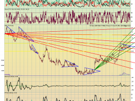 Das 1.Dreieck ist das rote. Nach einem Breakout & anschliessendem PULLBACK zur Spitze erfolgte der Thrust. Doch innerhalb des roten 3ecks wurden die Schenkel nach oben verletzt-es ergaben sich fuer die Zukunft Widerstaende, weswegen man das selbige 3eck noch groesser zeichnen kann: