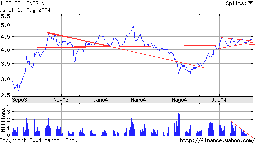 19. August 2004 Mit beeindruckenden Zahlen wartete an diesem Donnerstag Jubilee Mines auf. Dem viertgrößten australischen Nickelproduzent ist es mit Hilfe des hohen Nickelpreises gelungen, das Nettoergebnis im Geschäftsjahr 2003/2004 um 96 Prozent auf ein Rekordniveau von 95,1 Millionen Austral-Dollar zu steigern. Der Umsatz verbesserte sich gleichzeitig um 53 Prozent auf 235,4 Millionen Austral-Dollar.