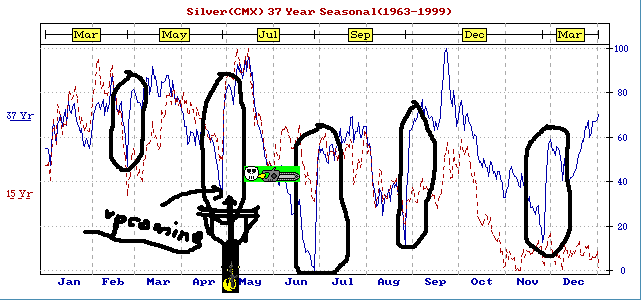 habe mir mal die Sesonal Charts der letzten 37 J bei Silver angeschaut und mit dem chartverhalten von Silver der letzten Monate angesehen und hier einen auffallenden Zusammenhang im Preisverhalten bei den Sprungstellen im seasonal chart im Preischart von Silver festgestellt!