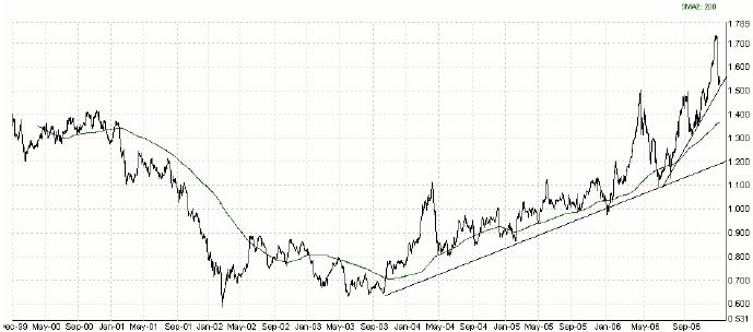 ".....So note the first trend line I have drawn. Not only is silver outperforming gold, but also it is increasingly outperforming gold! If we extend that trendline it hits 1.80 at the end of 2010. However, we also have a faster trendline that began earlier this year that suggests 100% leverage on any return on gold by the end of 2007....."