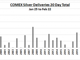 The final day to roll contracts forward to not be eligible for March delivery is Wednesday, February 24th. Given these are not normal times in terms of deliveries, it would not surprise me to see the decline for OI in March flatten out and stun the world by finishing with 40k contracts awaiting delivery. The COMEX only has registered stocks to cover 29.4k.