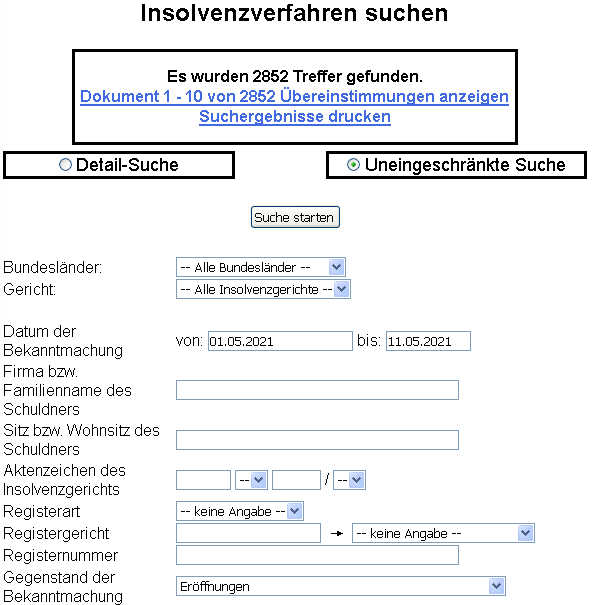 Ab 01.05.21 bis 10.05.21 23731 Insolvenzen.
