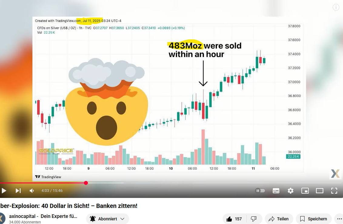 • Freitag hat jemand innerhalb 1 Stunde 483 Millionen Silberunzen auf den Markt geworfen, eine halbe Jahresproduktion. Hat aber den Preis nicht sehr gedrückt.