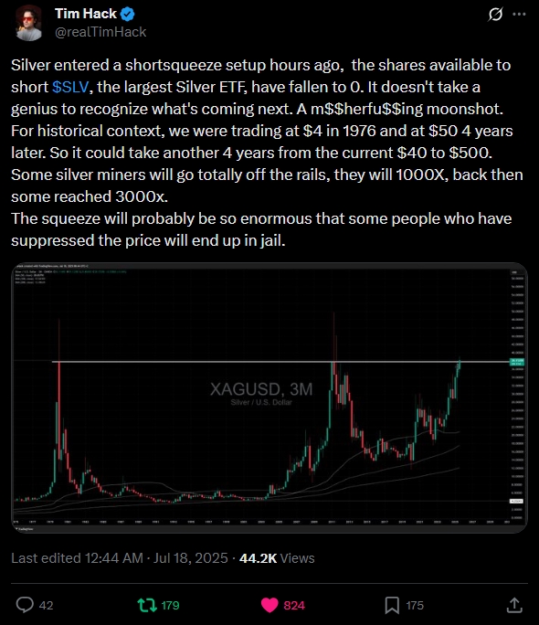 the shares available to short $SLV, the largest Silver ETF, have fallen to 0.