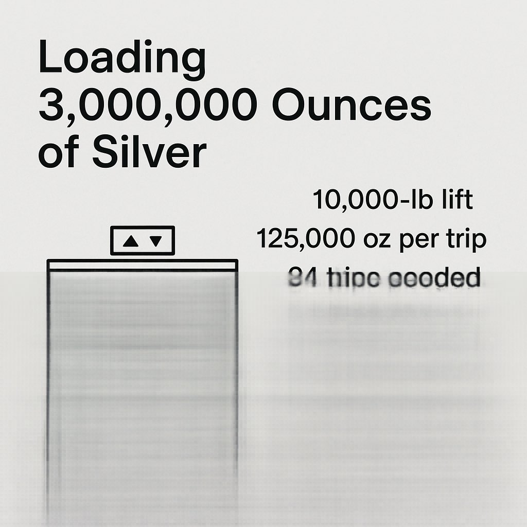 In Wirklichkeit dauert es einen ganzen Tag, nur um 3 Millionen Unzen auf Paletten zu laden, sie auf einen Aufzug zu stellen, der stark genug ist, um mit all diesem Gewicht durch den Gehweg nach oben zu fahren, und sie dann in einen gepanzerten Transporter zu laden. Wie viele Fahrten auf und ab sind das?