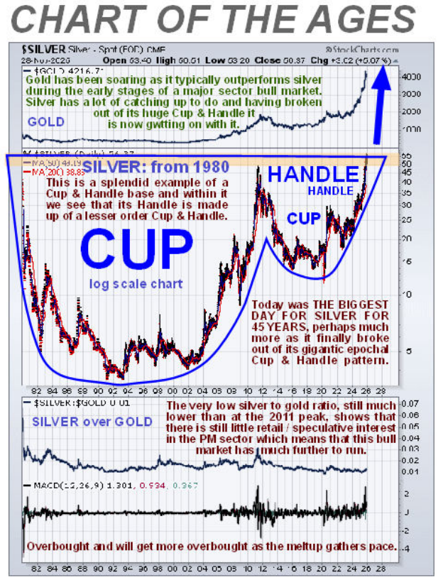 "Der Freitag, der 28. November, gilt als der wichtigste Tag in der Geschichte des Silbermarktes – warum? – denn als Ergebnis des Ausbruchs aus dem bullischen Ascending-Dreieck, das sich seit Mitte Oktober gebildet hat, hat es schließlich einen überzeugenden und entscheidenden Ausbruch aus dem gigantischen 45-jährigen Cup- und & Handle-Fortsetzungsmuster gemacht, das sich seit 1980 bildet, was es mit einem großen $ 3-Schritt getan hat, wie auf dem CHART...
