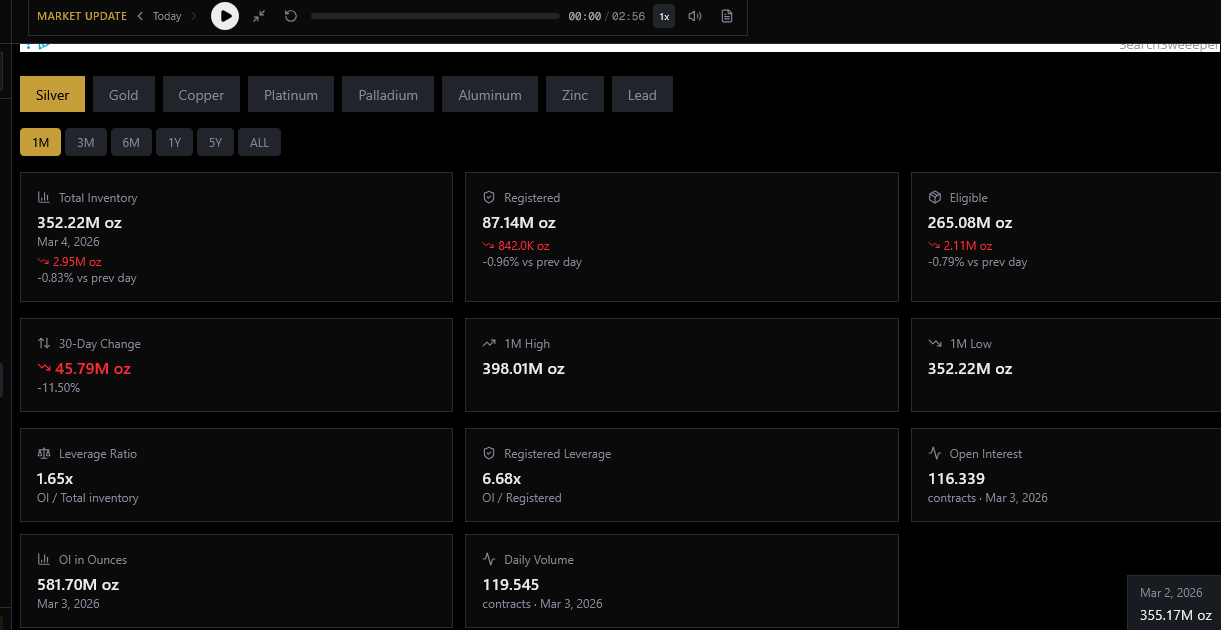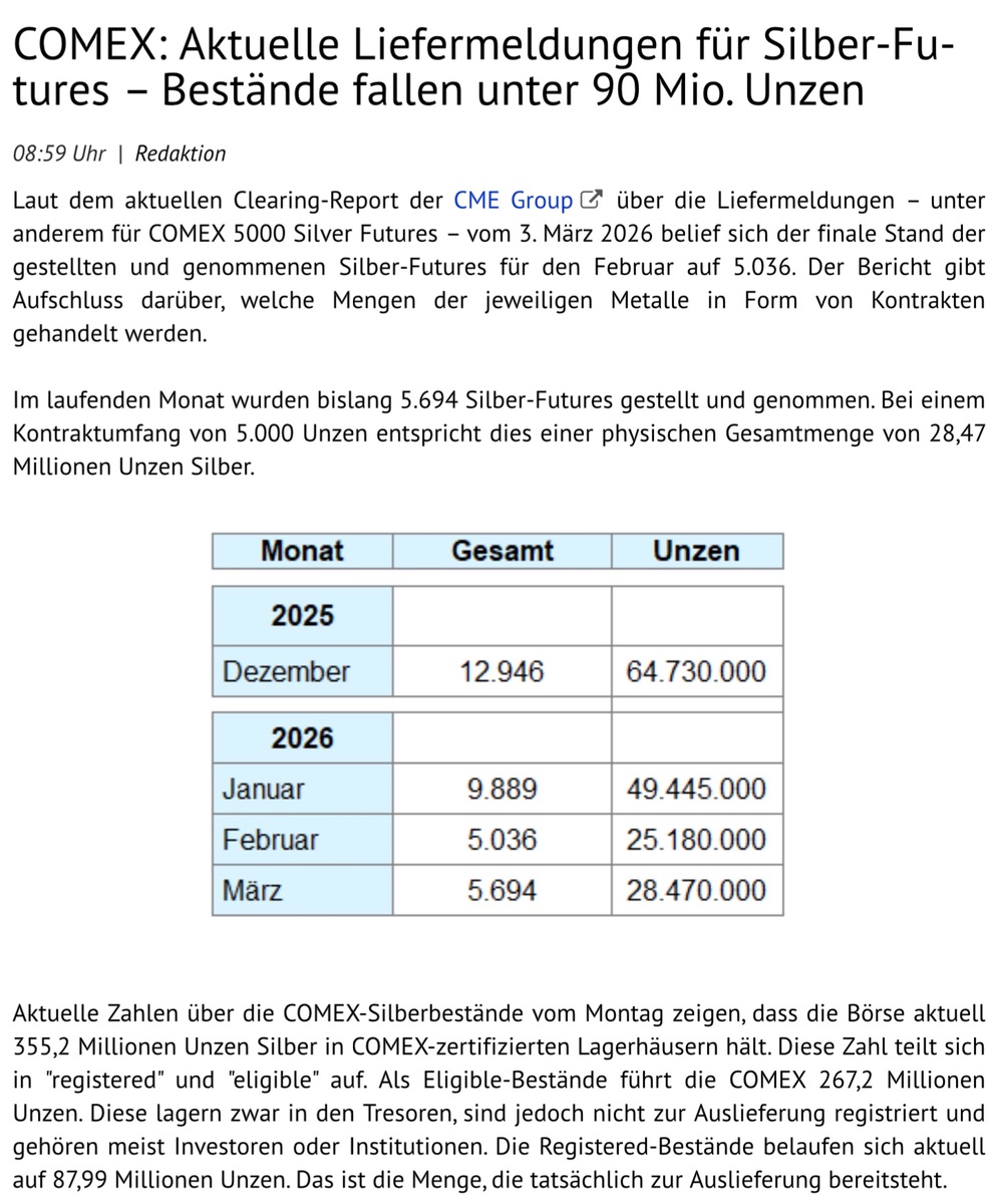 Andere nennenswerte Reserven sollten dann eigentlich nur irgendwelche SLVs (eher nur der PSLV) haben und diverse private Stacker weltweit. Wielange reicht das dann noch der Industrie und dem Krieg, und tauchen die Unzen in der Crimex jemals auf, ab welchem Preis? Und dann müssen die noch vorher! umgearbeitet werden, wobei die Schmelzen schon jetzt die Nachfrage nimmer schaffen! --> Mangel steht in der Schlange!