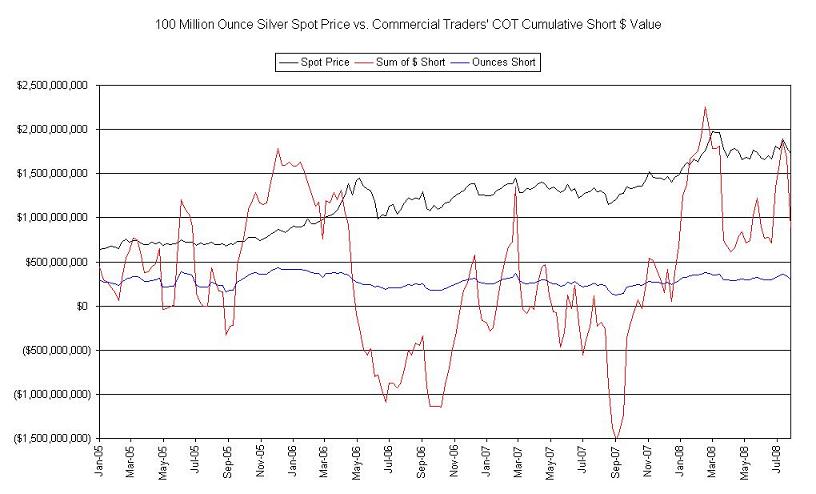 "....The chart below I first created in 2003 to get an idea of the trend of the commercial traders� silver short position. When the Sum of $ Short indicator is bottoming it is always associated with a short term low and a buying opportunity. August 2007 was obviously an amazing time to buy. I would expect the Sum of $ Short to bottom between $0 and -$500million when silver hits its bottom soon. There is no guarantee that we have to drop that low but this has been a very reliable indicator in the past. We are nearing a low risk buy point now...."