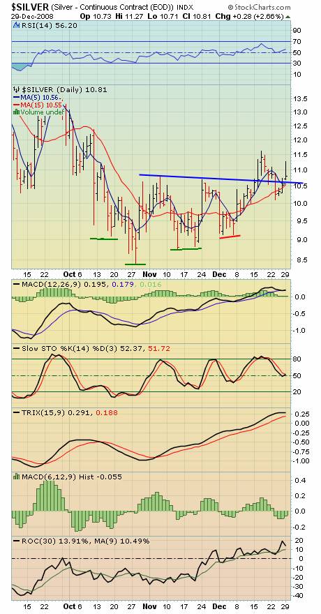 "...The silver chart below shows a potential H&S bottom. The left shoulder is marked with the green horizontal line, as is the head and the right shoulder. A 2nd right shoulder is marked with a red line. When a pattern loses symmetry, it can be a negative warning signal of failure of the pattern. Thus the red marker. At this point on the silver chart, it is a very small negative. What all metals investors should cheer for is for the whole H&S bottom turn out to be the head of a larger pattern. Whether that happens or not is unknown.