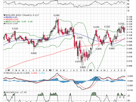 Grafik 21 zeigt Silber im Tageschart eingeklemmt in einem steigenden Keil, beide Trendlinien schon vier mal berührt. Aufsteigende Keile gelten als das Ende einer Bewegung. Brechen sie aber nach oben aus, so sind sie fulminant. Alle Korrekturen innerhalb des Keils sind gleicher Natur, alle sind steil. Es scheint viel mehr, dass eine Konstellation wie in den Aktienmärkten vorliegt, aber nach oben gerichtet. Auch scheint es unwahrscheinlich, dass Gold steigt, während Silber fällt.