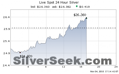• Für einige war der Anstieg heut wohl zuviel. Bei Kitco und godmod sprang der Silberpreis um 21:45 schlagartig von 26,26 auf 26,05 (zumindest bei mir) und zuckte sich dann nicht mehr, während es bei den anderen EM noch lustig rot und grün flackerte. Auf dem GS Portal wird der Schlußstand aber mit 26,36 angegeben. ??? Stecker gezogen?