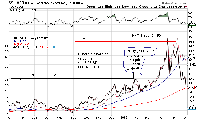 der Silberpreis im Jahr 2005 bis 2006 entfernte sich ganz schön von der 200-Tagelinie