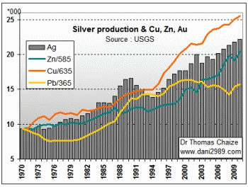 Die weltweite Produktion von Silber in 2010 hat natürlich mit der Zunahme der kombinierten Produktion von Kupfer, Zink und Gold gestiegen....Zwei Drittel der Silberproduktion ist nicht von der primären Silberminen gewonnen...