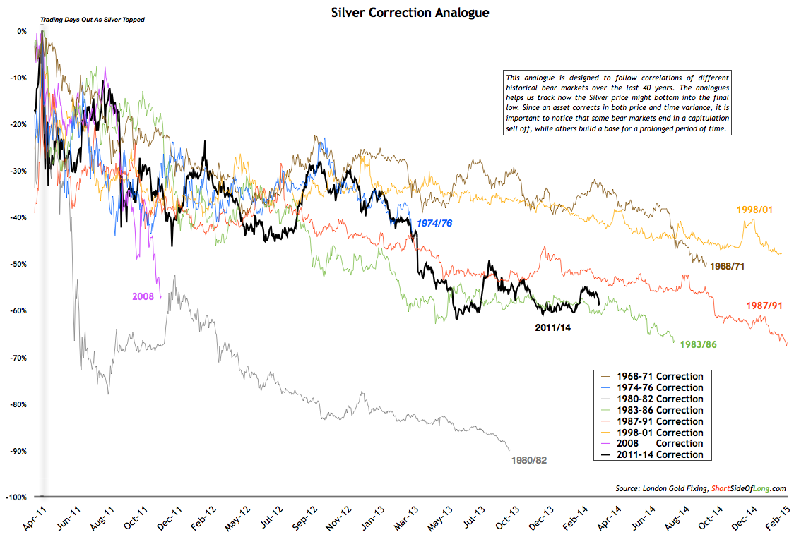Schöne Übersicht verschiedener Silber Bärmärkte. Die 3 Jahresentwicklung ist die schlechteste seit 1982... Der gute Tiho Brkan erinnert daran im Kontrast zum 5 Jahres Bullenmarkt des S&P 500....