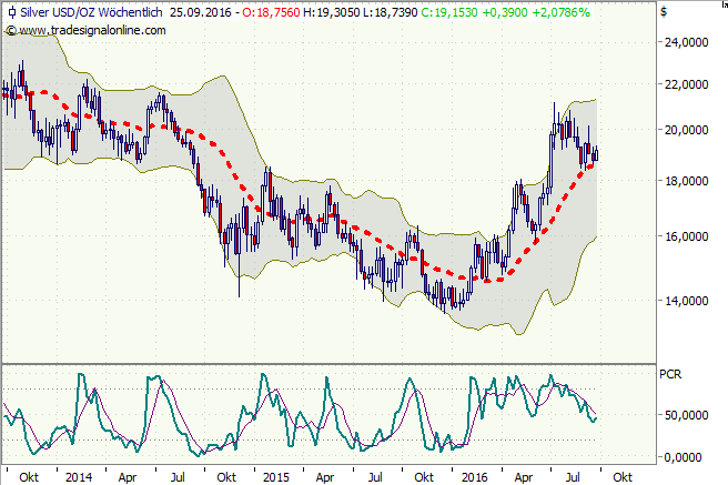 Auf Tagesbasis liegt ein Kaufsignal vor, auf Wochenbasis liegt noch kein Kaufsignal vor. Aber Silber hat seit Jahresanfang immer an der roten Mittellinie gedreht. Auf Monatsbasis ist der Aufwärtstrend intakt. 2009/2010 hat die Konsolidierung ca. 3 Monate gedauert.