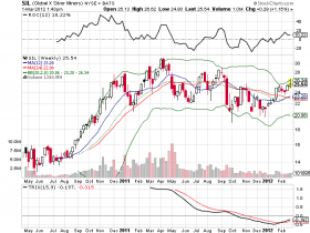 Bei SIL habe ich mal Fibonacci Retracements für den Anstieg seit Mitte Februar bis zum gestrigen Top eingebaut beim Chart (arithm.). Interessanterweise war exakt bei 50 % Schluss. Nach dieser jetzigen Erholung könnte dann noch die 61.8 % anvisiert werden. Da leg ich jetzt mein Augenmerk darauf. Dies könnte dann exakt mit der Aufwärtsttrendlinie zusammentreffen. Dies wäre dann rund 24.66 bei SIL und würde auch bei einzelnen Silberaktien wie EXK oder SSRI passen.