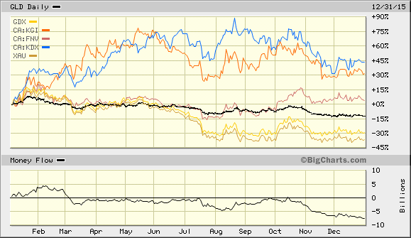In einem weiteren Chart habe ich dem GDX und Gold gegenübergestellt 5 Depotschwergewichte.